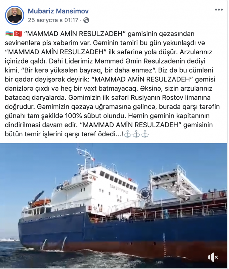 Beləliklə, 6 avqust, 2019-cu il, Mübariz Mənsimova malik Azərbaycan Cümhuriyyətinin qurucusu Məhəmməd Əmin Rəsulzadənin adını daşıyan gəmi, Türkiyədə Mərmərə dənizinə buraxıldı. Qısa vaxtda Liberiya bayraqlı “Doric Warrior” gəmisi dayandığı yerdə Mənsimovun gəmisini vurdu. Gəmi batmasa da xəsarət gördü. Gəminin vurulmasının “sifarişli” olduğu şübhəsi var. Bu günlərdə, yəni, avqustun 24-ü Mübariz Mənsimov öz rəsmi facebook səhifəsində “Mammad Amin Resulzadeh” gəmisinin artıq təmir olunduğu ilə bağlı post paylaşdı. Həmin postu burda da olduğu kimi bölüşürəm: